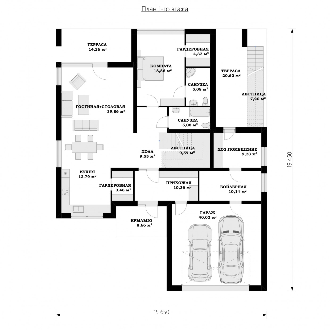Дом 19 на 16 с плоской крышей и гаражом идеально подходит для участка со средней шириной. Объект представлен в виде L-образной постройки, благодаря чему он имеет оригинальный вид.