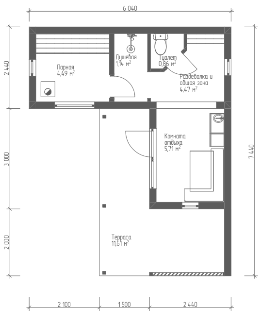 Формат 7×6 — это уже не просто баня, а отдельное пространство для отдыха площадью около 35–42 м², где можно комфортно разместить до 6 человек. В отличие от компактных решений, здесь реализована полноценная зона релакса, включая террасу и дополнительные опции.