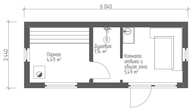 Такая конфигурация позволяет использовать баню как полноценную зону отдыха, несмотря на компактные размеры.