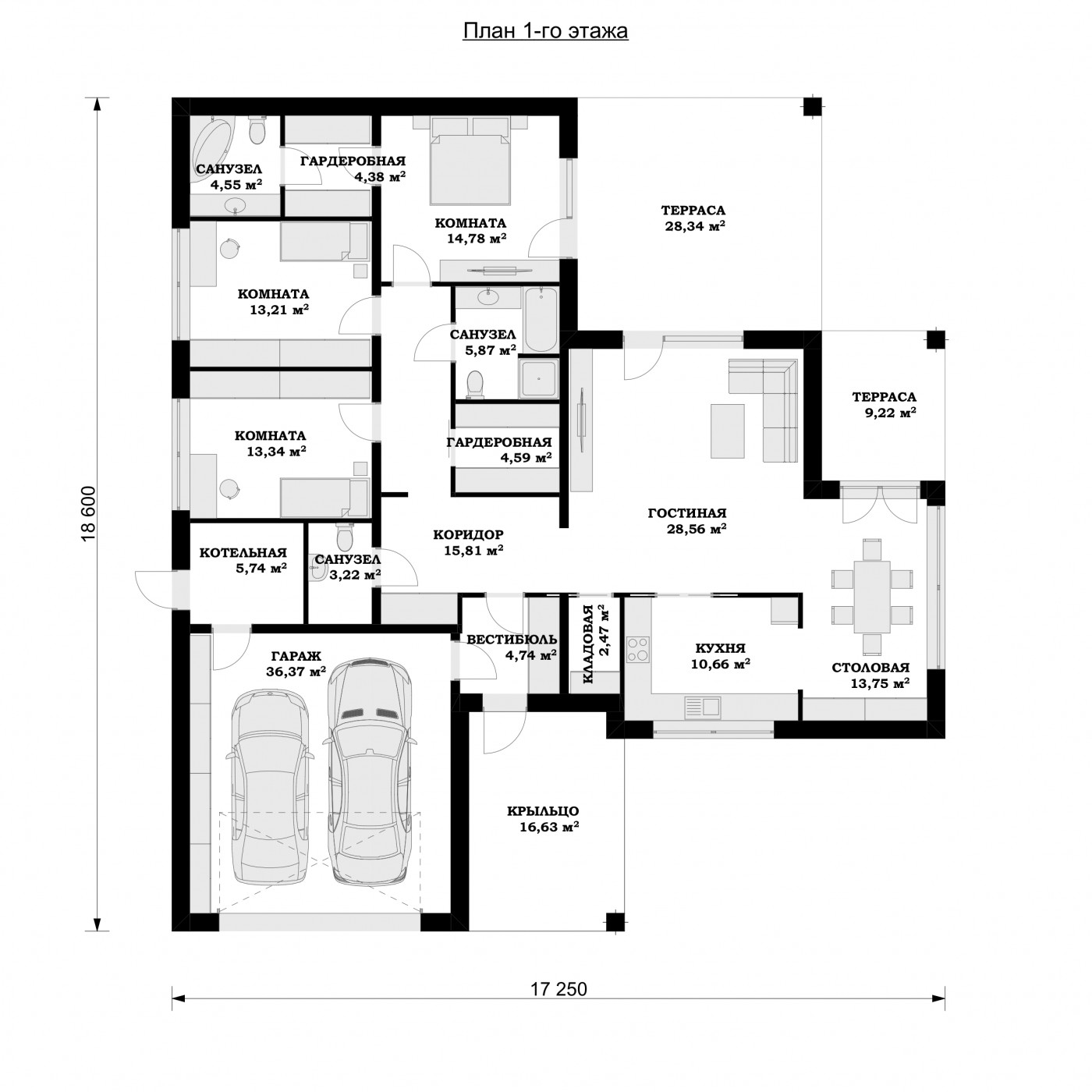Одноэтажный дом с плоской крышей 19 на 17 с гаражом