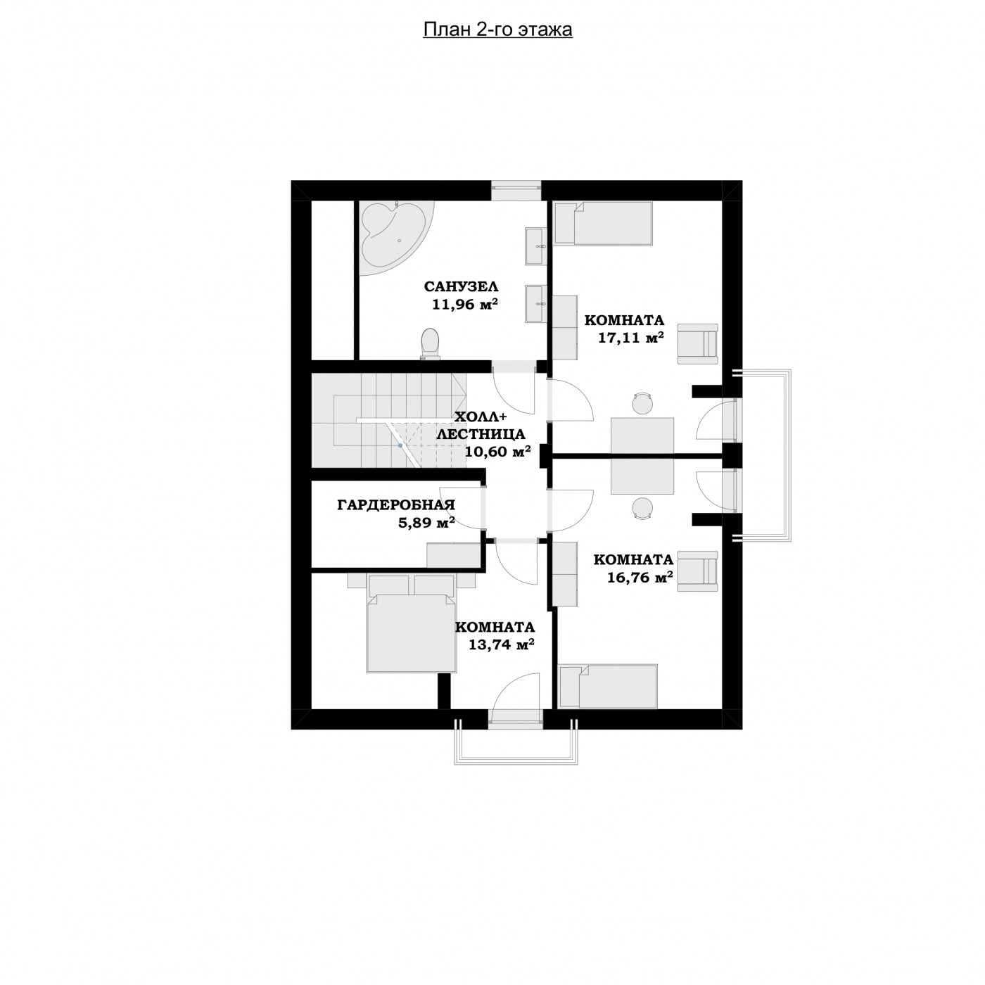 2 этаж 10 холл + лестница 11,31 м² 11 санузел 12,86 м² 12 комната 17,83 м² 13 комната 17,48 м² 14 комната 14,63 м² 15 гардеробная 6,38 м² Всего 80,49 м² |