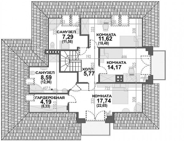 2 этаж 1 холл 5,77 м² 2 комната 18,48 м² 3 санузел 11,56 м² 4 санузел 12,96 м² 5 гардеробная 8,33 м² 6 комната 22,65 м² 7 комната 14,17 м² Всего 93,92 м² |