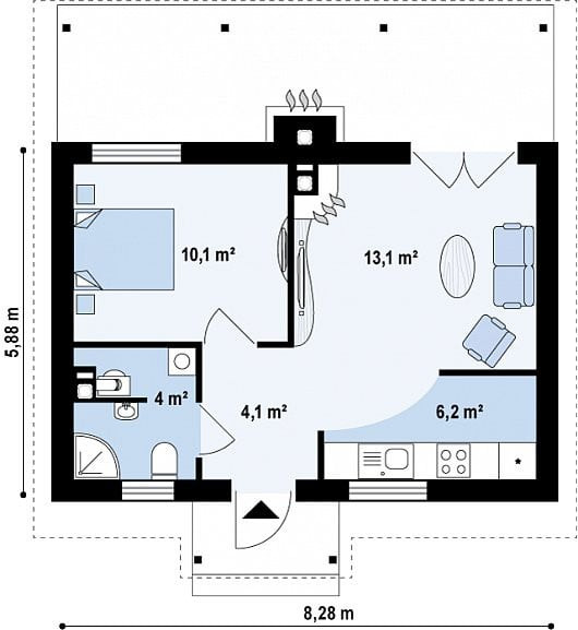 Дом по проекту "Берн" является одним из серии маленьких домов. Проект одноэтажного дома 6 на 8 можно рассматривать, как альтернативу однокомнатной квартире.