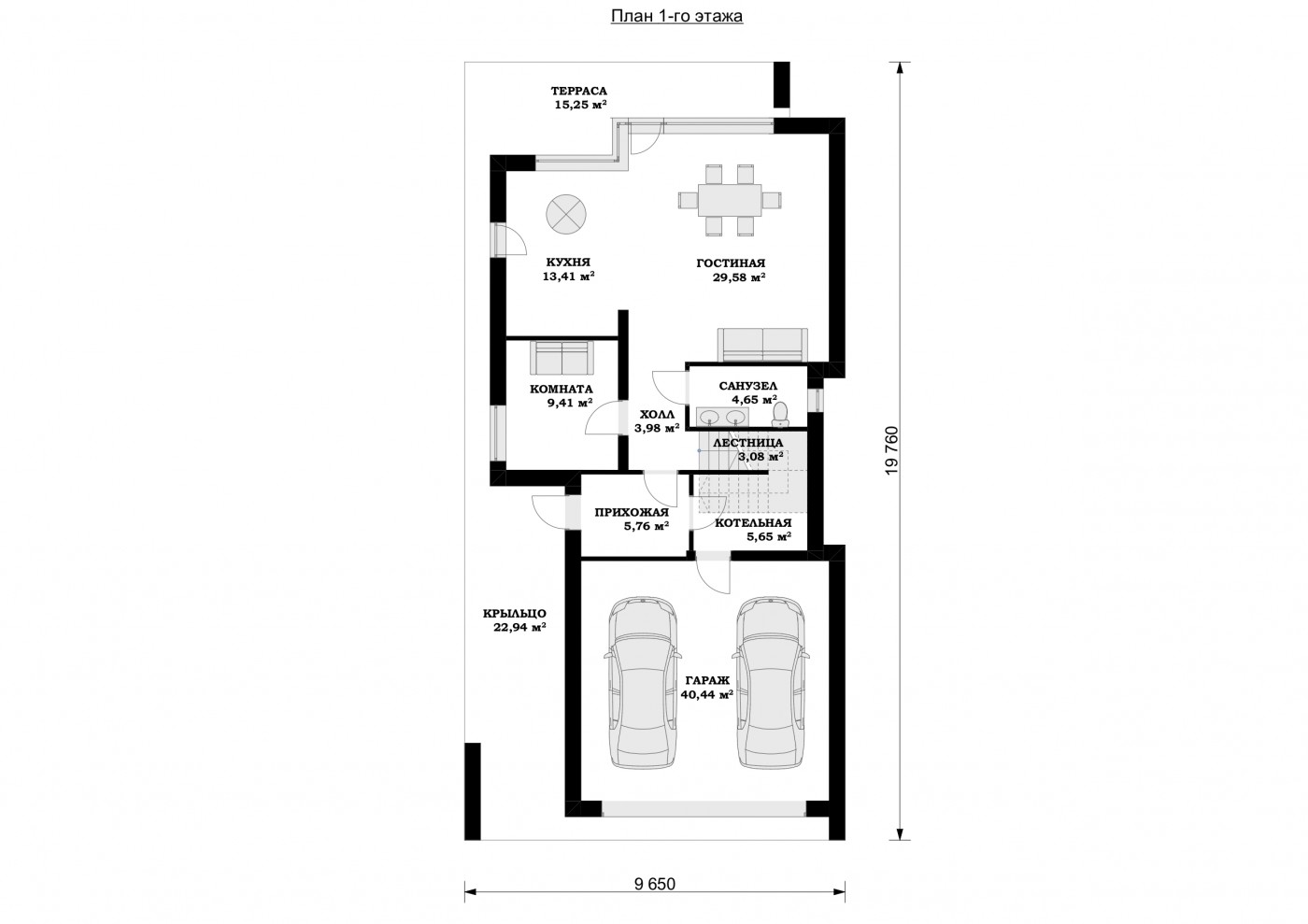 1 этаж 1 прихожая 5,58 м² 2 коридор 3,94 м² 3 комната 9,41 м² 4 кухня 11,93 м² 5 гостиная 28,58 м² 6 санузел 4,34 м² 7 лестница 3,26 м² 8 котельная 5,7 м² 9 гараж 37,93 м² 10 терраса 23,96 м² Всего 110,67 м² |